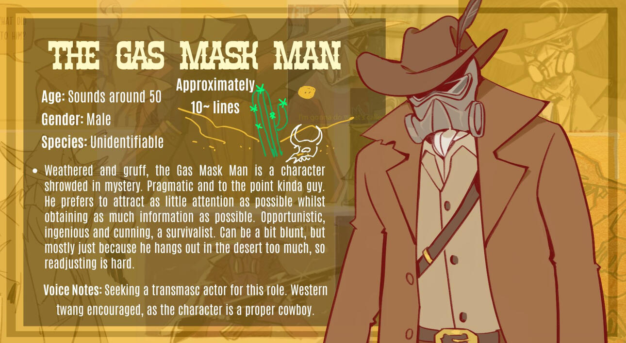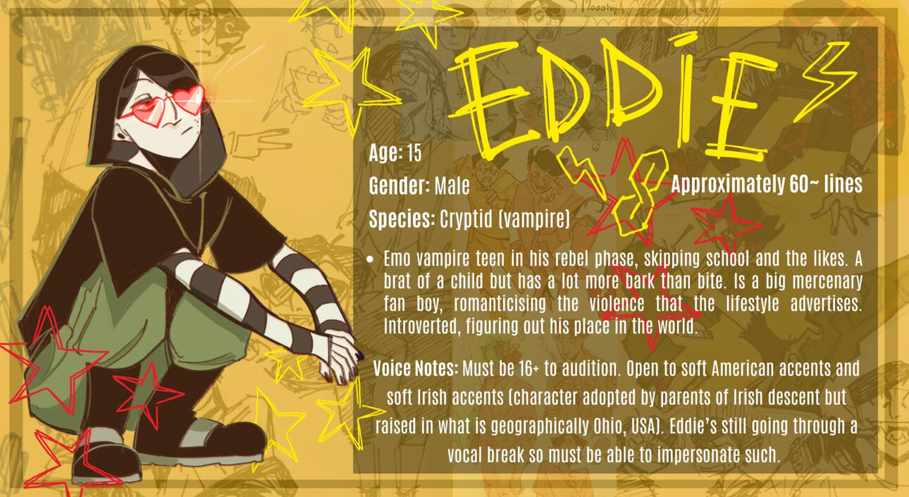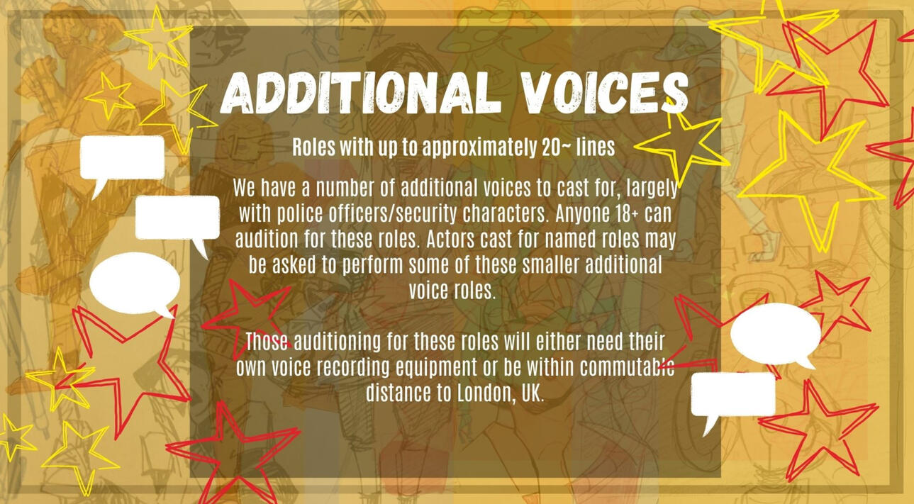 Please label your email’s subject bar with ‘CHARACTER NAME-AUDITION-YOUR NAME’.Please specify in your email where you are located and if you are auditioning as a 16/17-year-old. Please note that there is foul language used in the dialogue.People of any gender identity may audition for any character, even if their gender identity does not align with that of the character. The only character we have specifications surrounding regarding this is that we are seeking transmasc actors for the Gas Mask Man.Please specify if you have your own professional sound recording setup and/or are within commuting distance to London, UK. Live recordings are scheduled to be in London mid/late May. Travel expenses within commuting distance are covered. Arrangements can potentially be made to record from home for those auditioning outside of commuting distance/internationally.If you are cast for a named character you may be asked to do a couple of lines for small additional voice roles.If you have any questions or wish to enquire about additional details please email [email protected]