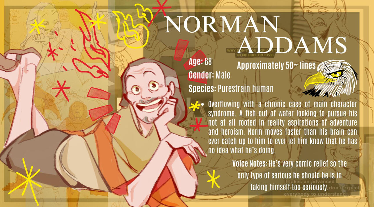 "You want to hear about my life? Why, uhh, yes! Of course! Where does one even begin! … Umm… so… where would you like me to begin? Well, I could start with one of my most perilous adventures from my youth. I call this one, ADDAMS AND THE ANAESTHESIOLOGIST. It was a dark Wednesday afternoon, and I, my bowels had been in great disarray, and so I had a colonoscopy awaiting me. Unshaken by fear, I traversed to the hospital. When I arrived and they checked me in, I patiently sat, unperturbed by the hold up, as it gave me plenty of time to do my sit down yoga. A fascinating technique a doctor told me about online that has kept me in the physique you find me in today. When it came time to go into the appointment, they were to give me anaesthetics to help me go under. But not for Norman Addams! I bravely had the inspection without any need for anaesthetics! Apparently, the moment the needle touched my skin, I nobly passed out before they even could administer it to me. Just one of the many heroic stories from my lifetime, would you like to hear another?"